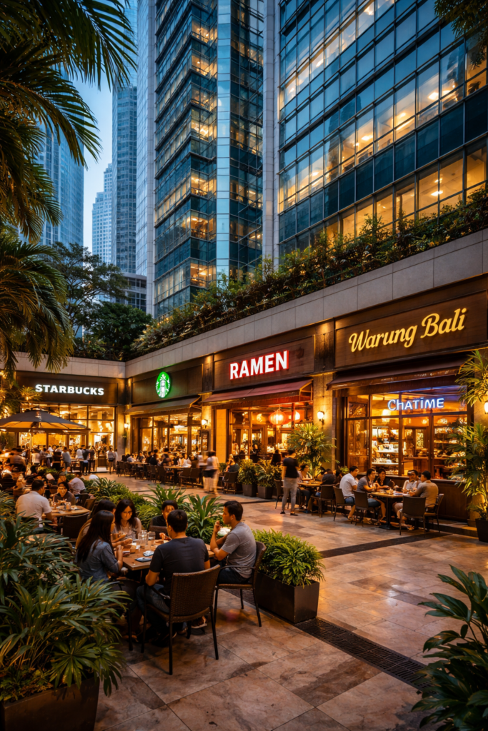 ジャカルタには多くのオフィスビルが立ち並び、ビルの下や中層階にレストランを出店することができます。